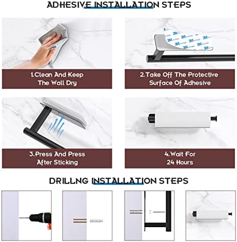 ☞【Multiple Installation Options】: Applicable for both adhesive and screws. Self adhesive paper towel holder design suits smooth surfaces as tiles, glass, wood, marble, metal. Install and fix with auxiliary stickers, press stick on paper towel holder for about 20 seconds then use it after 24 hours. On rough surfaces, paper towel holder wall mount can be installed with screws