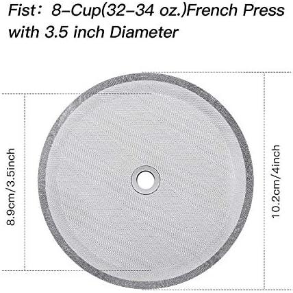 Measurement: the size of the french press replacement screen is approx. 4 inches in diameter, 5/16 inches hole, proper size can fit for most coffee presses, please check carefully before your choosing