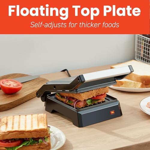 FLOATING TOP PLATE: The top grill plate automatically adjusts to accommodate thicker breads so you can pile on your favorite veggies, cheeses & meats for hot fresh deli type grilled sandwiches and burgers.