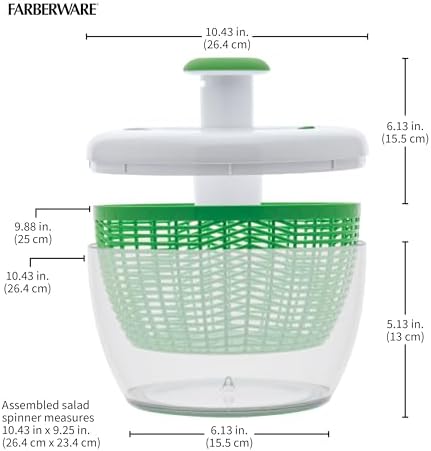 The Farberware Pro Pump Salad Spinner is an indispensable kitchen device with multiple uses. Not only is it an easy-to-use lettuce spinner, it will be one of your favorite large salad bowls and mixing bowls. For meal prep, you can both wash and dry salad greens, other vegetables, and fruits in seconds. The bowl features a soft, non-slip base, so it won’t slide off your countertop while you’re spinning and the soft-touch brake button stops the salad spinner immediately when desired. You can also use the basket as a colander. Say goodbye to soggy. It’s time to start enjoying quick and easy healthy eating every day with salads and produce that are crisp, delicious, and so very nutritious! Measures 10.31 inch x 10.31 inch x 7.44 inch. Hand wash only.