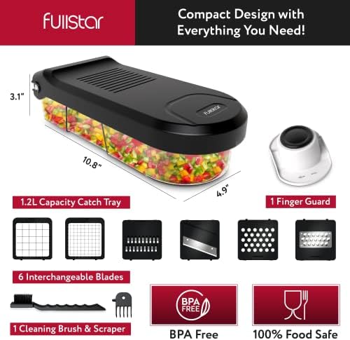 Great Value & Quality – The Fullstar vegetable chopper is an affordable mandoline slicer and cheese grater that doesn’t compromise on quality. It includes 6 stainless steel blades, 1 cleaning brush, 1 finger guard, and a 1.2L container for safe and efficient meal prepping.