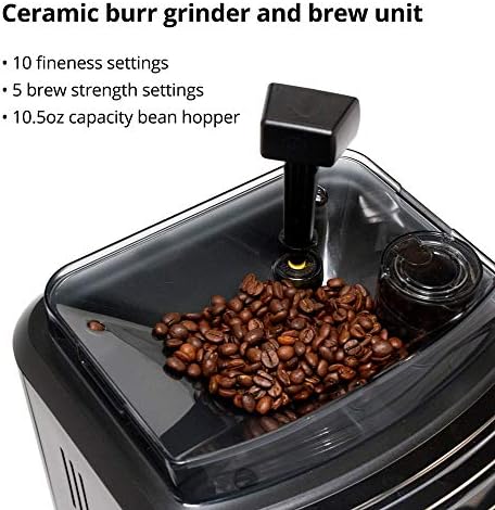 Ceramic burr grinder and brew unit: ceramic burr grinder with 10 fineness settings, 5 brew strength settings, and bean hopper with 10.5oz capacity