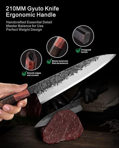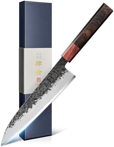 ERGONOMIC & BALANCED HANDLE: The Kanngou gyuto chef knife features a handle crafted from a blend of premium ebony and red sandalwood. This luxurious combination not only adds elegance to your kitchen but also provides a comfortable and secure grip. The balance and ergonomic design ensure precise, effortless cutting.