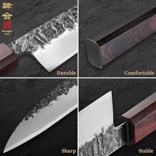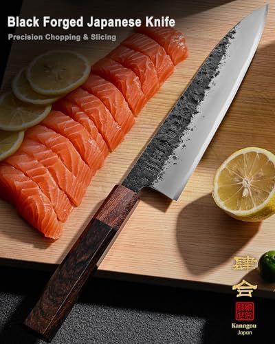 TIMELESS CRAFTSMANSHIP: The Kanngou Japanese Chef Knife is crafted using traditional Japanese techniques, specifically Kurouchi Nashiji (Black-Forged). This process gives the chefs knife a distinctive blackened finish that enhances durability and resists rust. The Nashiji hammered texture not only looks impressive but also reduces friction, allowing for smoother cuts.