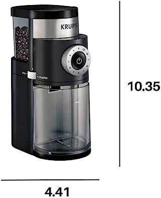 Elevate your coffee experience with the KRUPS Precision Burr Coffee Grinder. This versatile tool features 12 precision settings, allowing you to customize your grind size from fine to coarse, perfect for various brewing methods including drip coffee, french press, espresso, pour over, and cold brew. Powered by a 110-watt motor, the flat metallic burr mechanism ensures uniform grinding for consistent flavor extraction. The burr design preserves your coffee’s aromatic qualities by maintaining optimal grinding speed and minimizing heat build-up. With its 8 oz bean hopper and removable grounds container, this grinder can produce enough coffee for up to 32 cups, accommodating both individual servings and larger batches efficiently. User-friendly operation includes an intuitive on/off button with auto-stop function. Select the number of cups (2-12) for precise measurements, reducing waste. The removable top burr and included cleaning brush make maintenance simple. Constructed with durable stainless steel, this grinder is built to last and maintain consistent performance. Its sleek design complements modern kitchens while delivering professional-grade results at home. To use, select your desired grind size using the 12-point scale. For french press or cold brew, use a coarser grind; for drip coffee, choose medium; and for espresso, opt for fine. Always use fresh, whole beans for the best flavor. Fill the hopper, select the number of cups, and press start. For optimal flavor, grind your beans just before brewing. To clean, unplug the grinder, remove the top burr, and use the included brush to clean residual grounds. The removable grounds container can be washed with mild soap and water; ensure it’s dry before reassembling. KRUPS backs this grinder with a two-year warranty. Whether you’re a coffee connoisseur or just starting your journey into freshly ground coffee, the KRUPS Precision Burr Coffee Grinder delivers consistent, flavorful results with every brew.