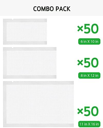 PreCut Design: Total 150 count 11″ x 16″ gallon size and 8″ x 12″ quart size and 6″ x 10″ pint size pre-cut bags. Just pull out and use; no need to cut, no need to seal one side before putting food in.