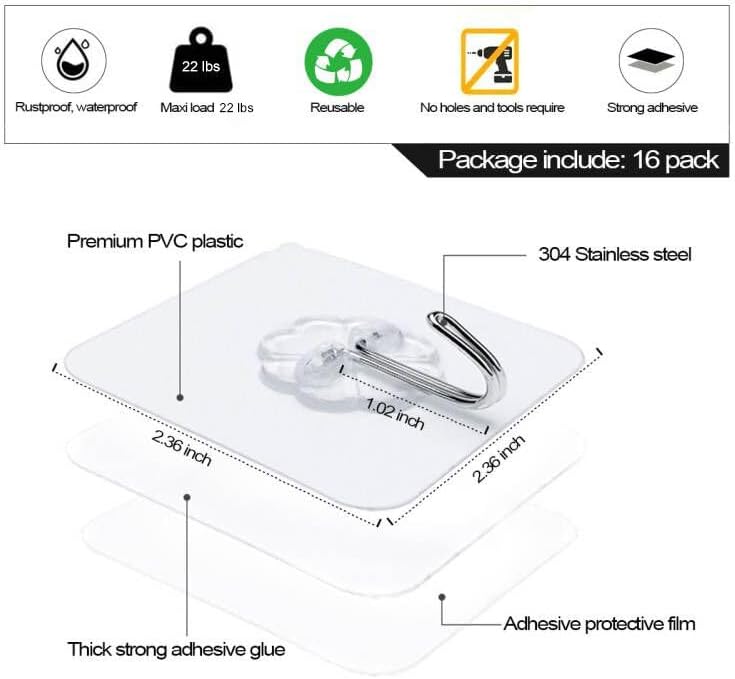 Stainless Steel Self Adhesive Hooks – RustProof and waterproof adhesive wall hooks: 16 sticky hooks in one pack, the wall hooks for hanging are made of stainless steel and pc material,rustproof,waterproof, oilproof and durable. Adhesive hooks for hanging can be used in living room, kitchen, bathroom shower wall, behind door, outdoor etc.